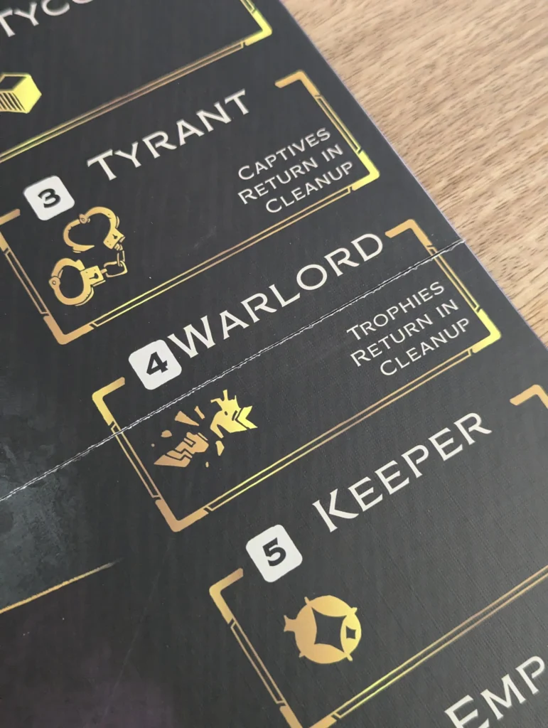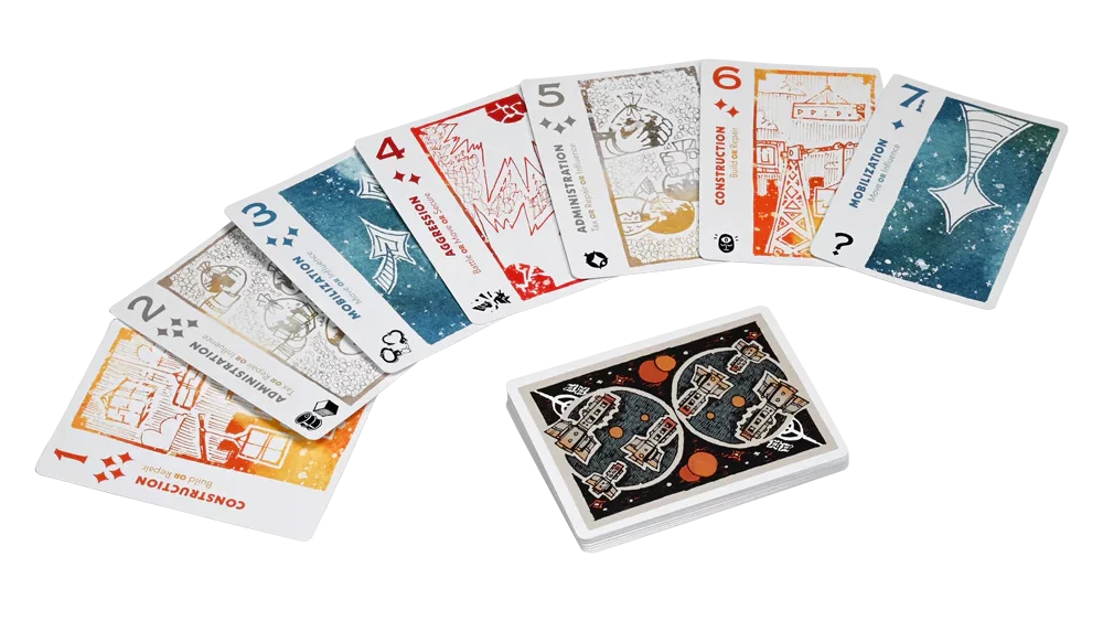 Uno de los aspectos más peculiares de «Arcs» es su sistema de bazas. A diferencia de otros juegos donde los jugadores tienen libertad total para decidir qué acciones realizar en cada turno, aquí las decisiones están guiadas por las cartas que se juegan en cada baza. Este sistema de bazas implica que, al inicio de cada ronda, los jugadores juegan cartas de su mano que determinan no solo sus propias acciones, sino también las oportunidades para los demás jugadores. Quien gana la baza tiene la ventaja de elegir primero, pero los demás también podrán actuar en función de las cartas jugadas.