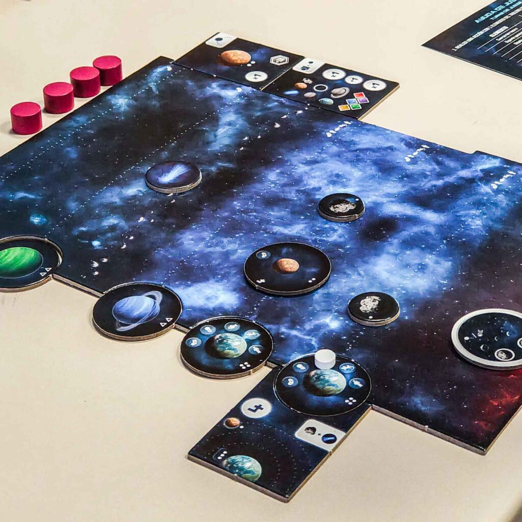 Cosmogenesis, juego con mecánica principal de draft en el que cada jugador tiene que construir su sistema solar, mientras gana puntos cumpliendo objetivos.