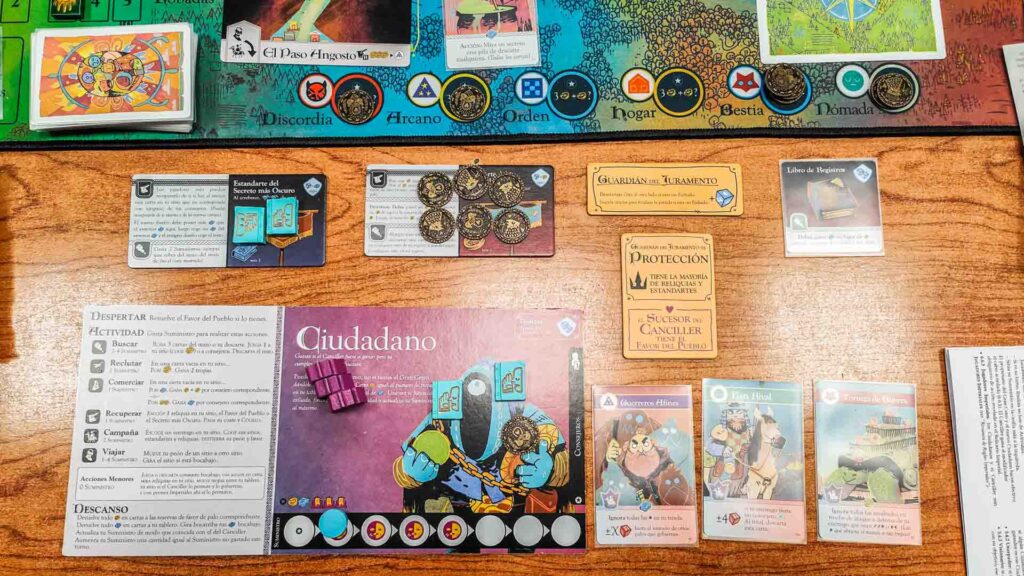 «Otra partida a Oath. En esta ocasión había dos personas que jugaban por primera vez pero lo pillaron pronto y en seguida el juego empezó a rodar: búsquedas en los distintos mazos de cartas, movimientos audaces, intercambio de favores y secretos… Todo llevaba un ritmo relativamente tranquilo hasta que empezaron a surgir las visiones y la situación del Canciller se volvió complicada. Esto motivó una oferta, aceptada, de formar parte del Imperio. Poco tiempo tardaron en volar los puñales entre el Canciller y el nuevo ciudadano, ay, ¡habría ganado con un 6! Unos últimos turnos llenos de tramas, pactos entre enemigos y fintas dentro de las fintas. Cuanto más se juega Oath, más mejora este dichoso juego creado por el bueno de Cole Wehrle».