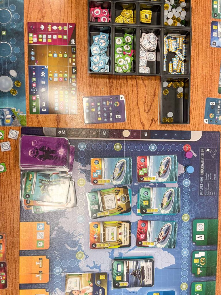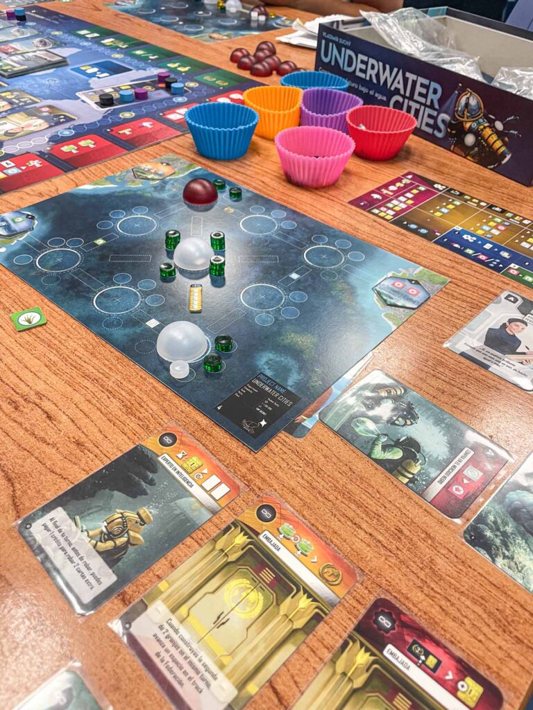 En Underwater Cities, cada jugador compite por construir una red de ciudades submarinas autosuficientes, conectadas por túneles, usando estructuras como granjas de kelp, plantas desalinizadoras y laboratorios.
