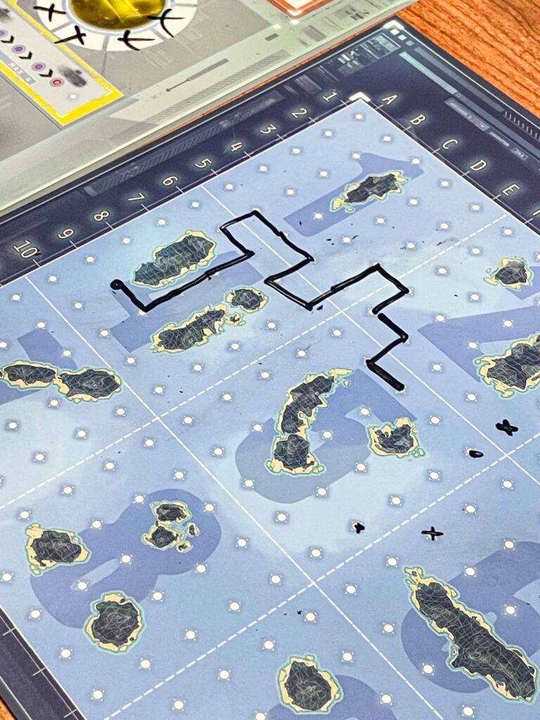 Cada equipo tiene que organizar a sus tripulantes para cubrir los 4 roles: capitán, ingeniero, primer oficial y operador de radio (aunque mola más llamarlo espía). En base a escuchar al capitán del otro equipo, el espía dibuja el mapa con la ruta seguida por los enemigos. Con esta información y en base a los armas disponibles, se toman decisiones como la disparar o de localizar al otro equipo.